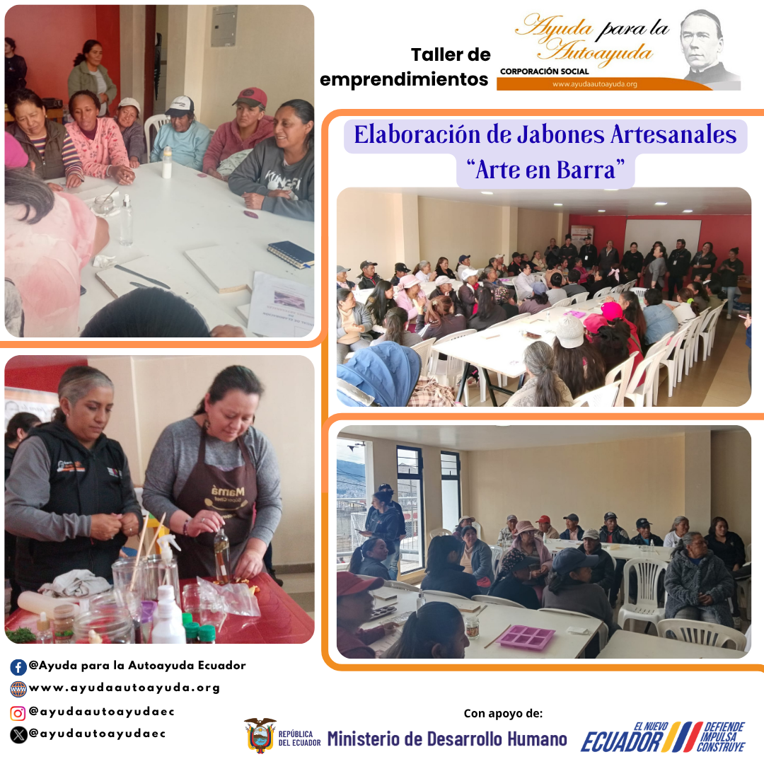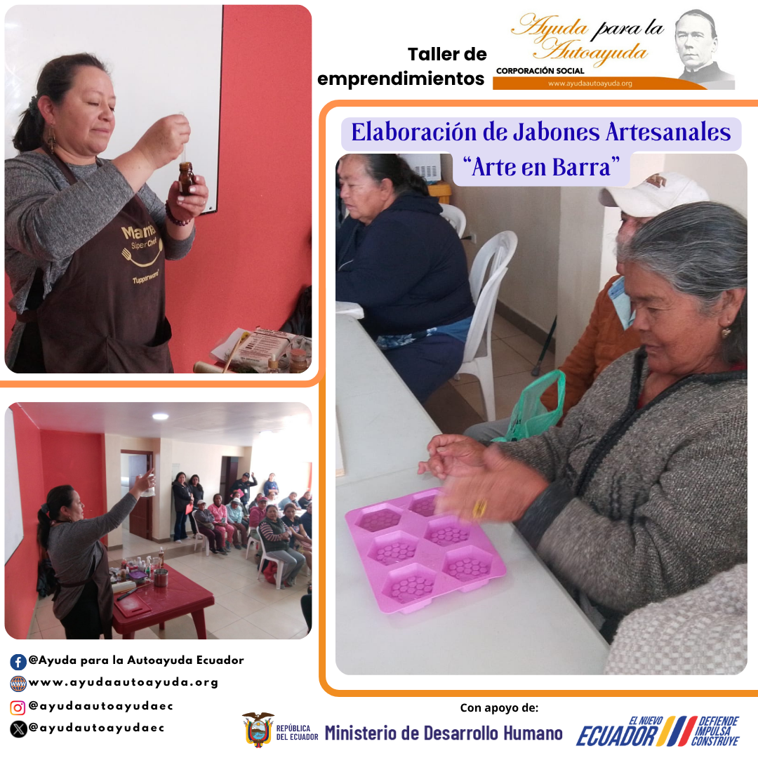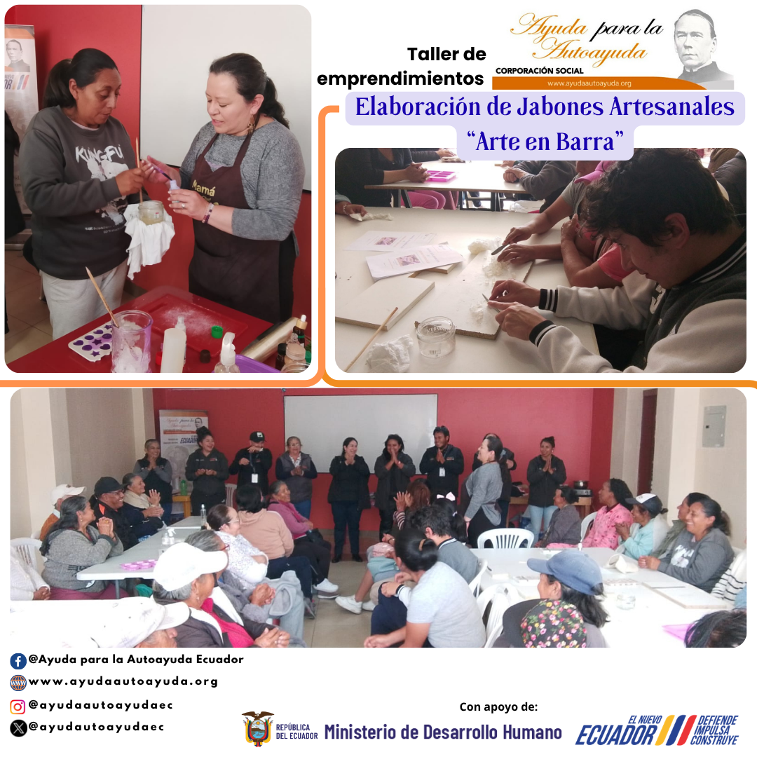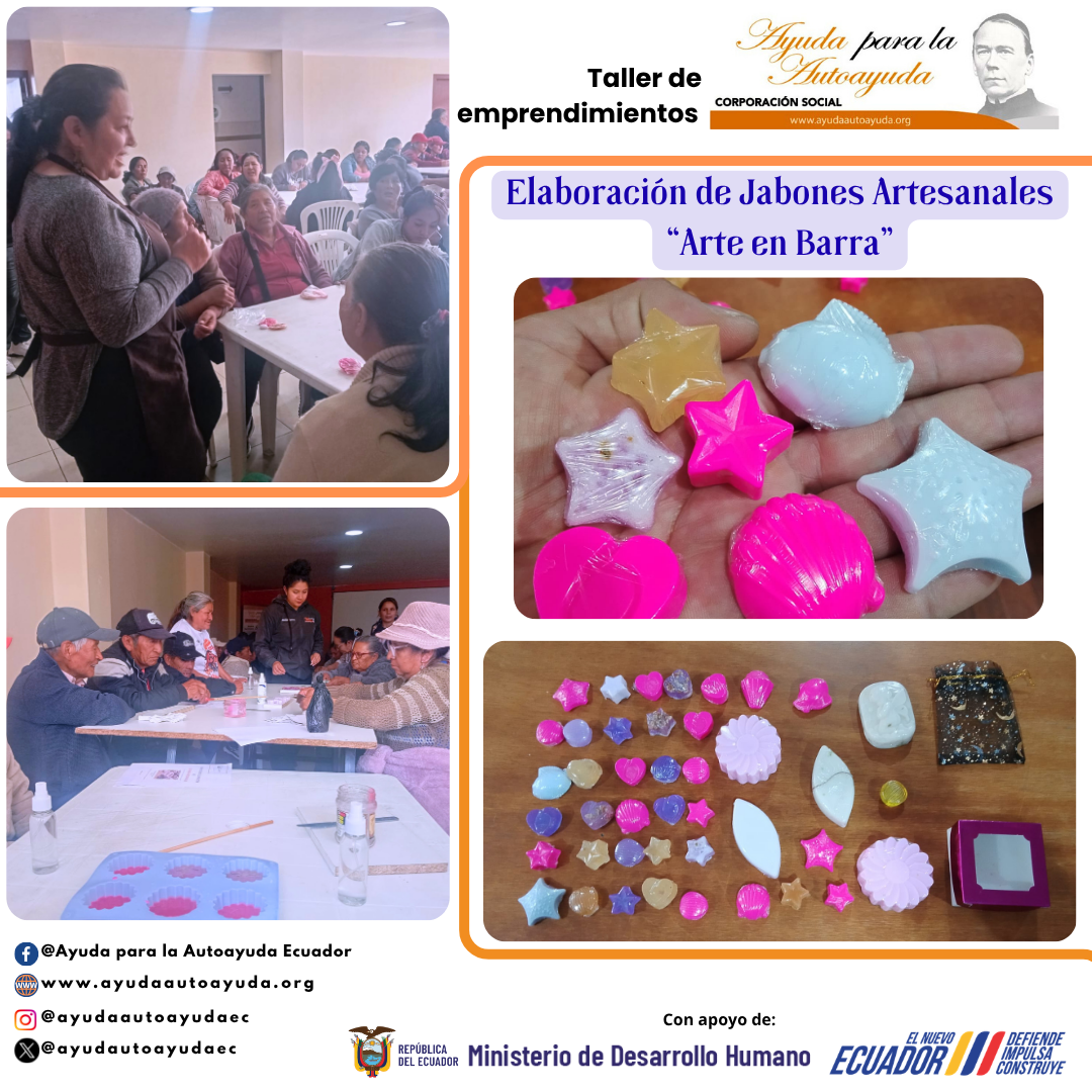 El equipo Técnico de la Corporación Social Ayuda para la Autoayuda Ecuador reaslizó taller de elaboración de jabones artesanales “Arte en Barra”, donde la comunidad fue la principal participante. La actividad estuvo orientada al fortalecimiento de habilidades prácticas como una alternativa de autoempleo y generación de ingresos.